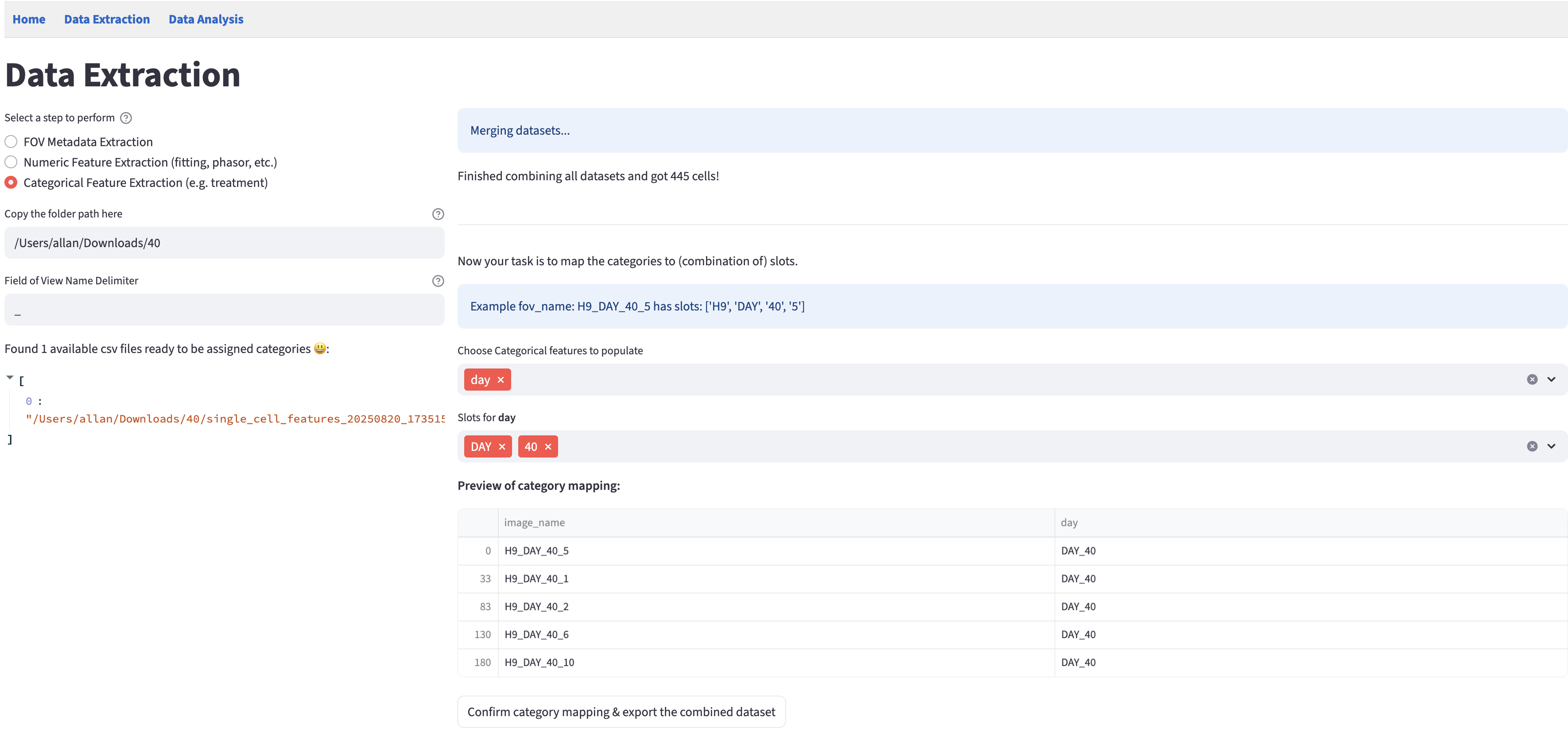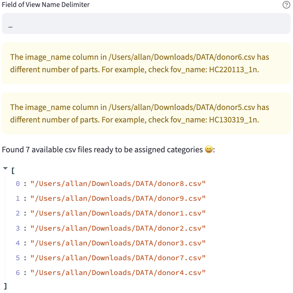 The FOV identifier uniquely identifies a field of view and is assumed to contain all information necessary to extract the categorical features (e.g., treatment, time point, etc.), by including segments separated by a certain delimiter (e.g., _). Categorical features are assigned from individual segments or their combinations. Example: The FOV Panc1_Cyanide_dish1 denotes that it comes from the Panc1 cell line, under the Cyanide treatment, in the 1st dish.