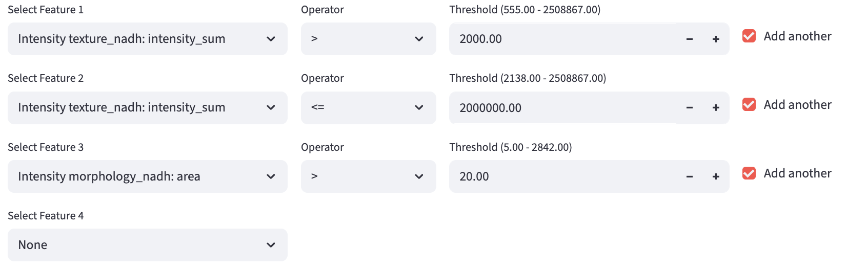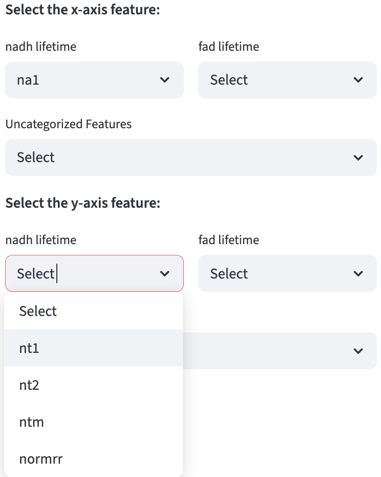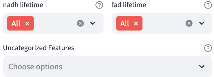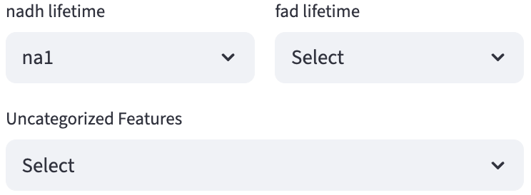 The unique row id and field of view id are used to help users identify the row (e.g. a single cell) and field of view (e.g. a single image) of data of interest through the built-in hover-based interaction. Numerical and categorical features are used to render shared widgets. Internally, FLIM Playground will check whether the dataset fulfills the requirements and output meaningful warning or error messages.