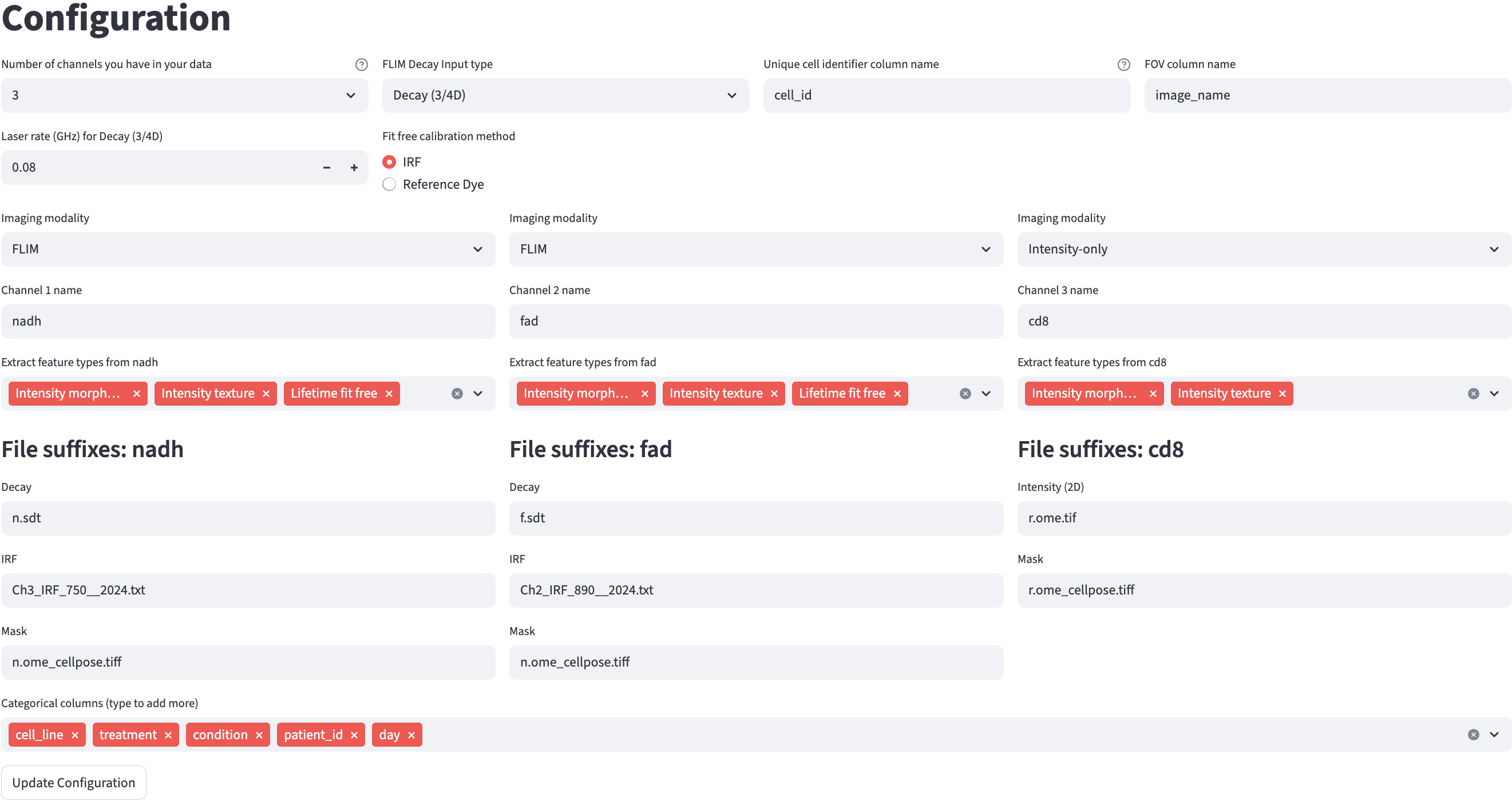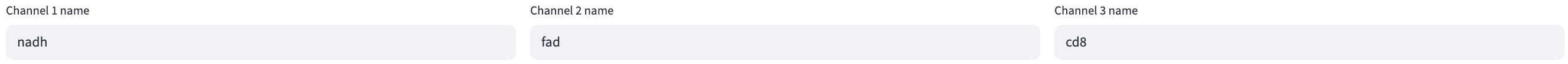 In the example above, channels nadh and fad were asked to provide an IRF file, while channel cd8 did not, because Lifetime fit was selected for the former two channels and not for the latter. The file suffixes of the IRF files were different for each of the two channels, but they shared the same ROI mask file suffix because they used the same ROI mask. The cd8 channel used a different ROI mask than the other two channels, indicated by the mask file suffix.